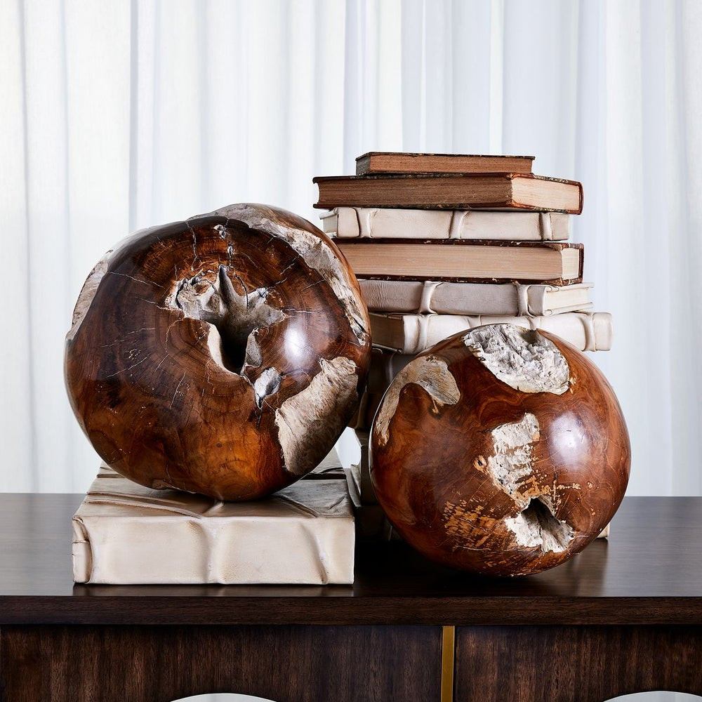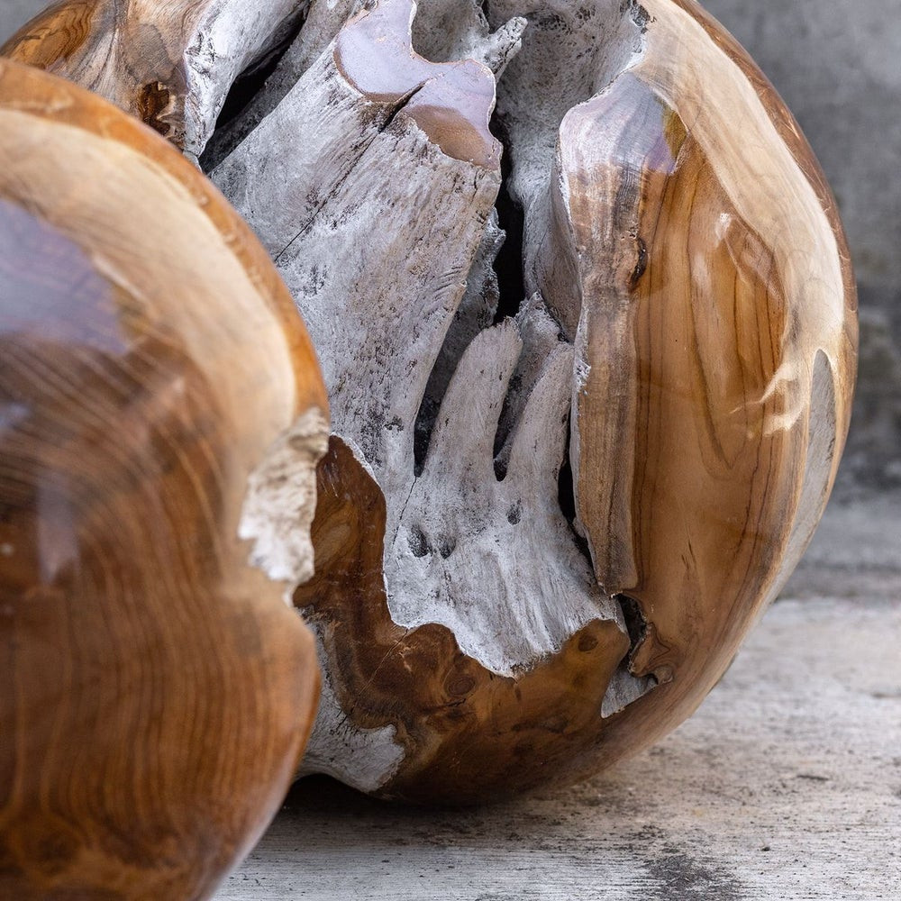 Handcrafted from solid teak wood, these accessories have a polished natural outer finish with a light gray interior finish. Because each is individually handcrafted, sizes may vary. Cracks and variations in the grain are natural to this type of wood. Sm- 10x10x10, Lg- 12x12x12. 12 W X 12 H X 12 D (in) - Additional Information