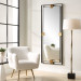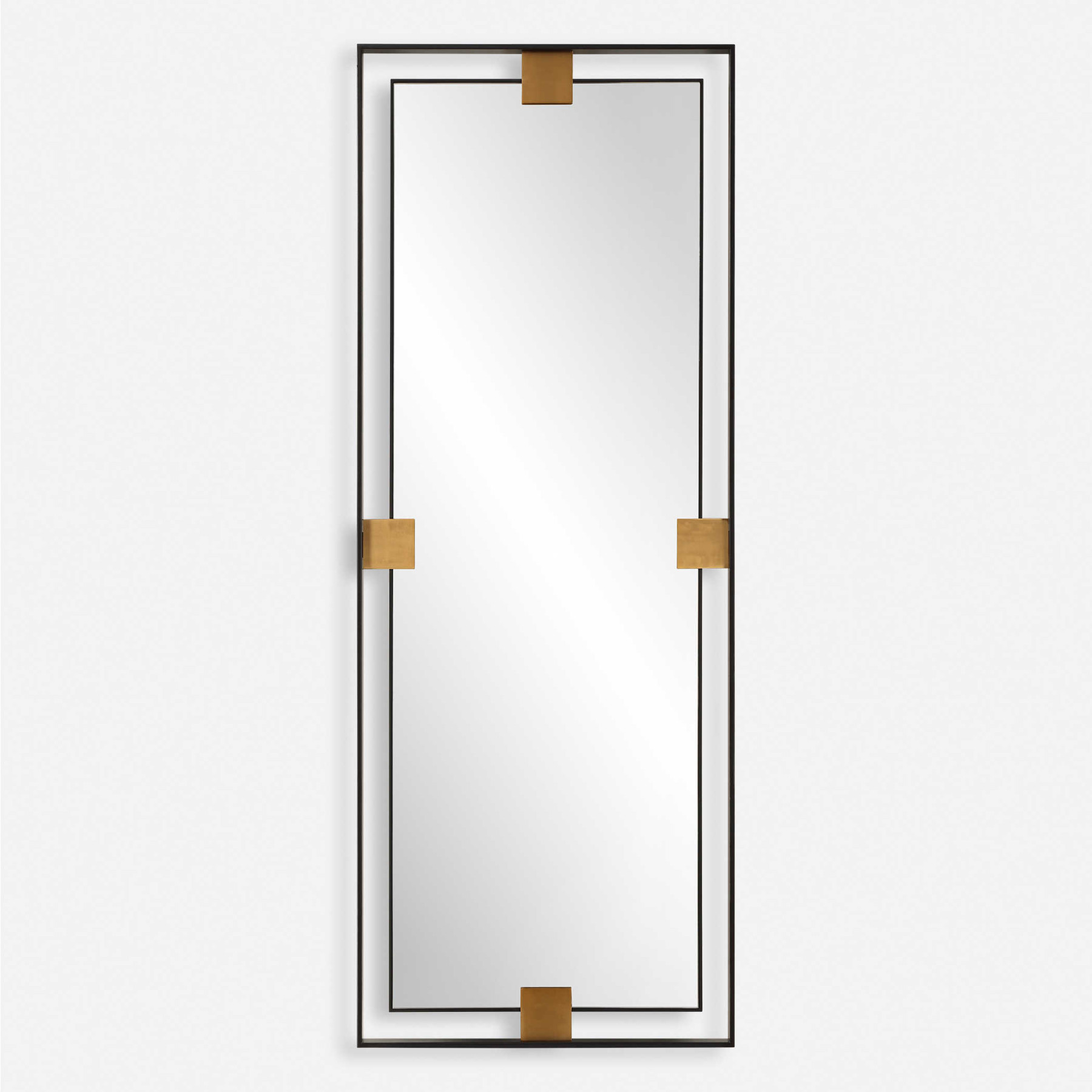 The Cornerstone Mirror, oversized in stature, features plated brushed brass details surrounded by a metal, free-floating boarder finished in a sleek satin black. May be hung horizontal or vertical. 95 pounds, shipped by Motor Freight. - Additional Information