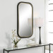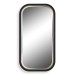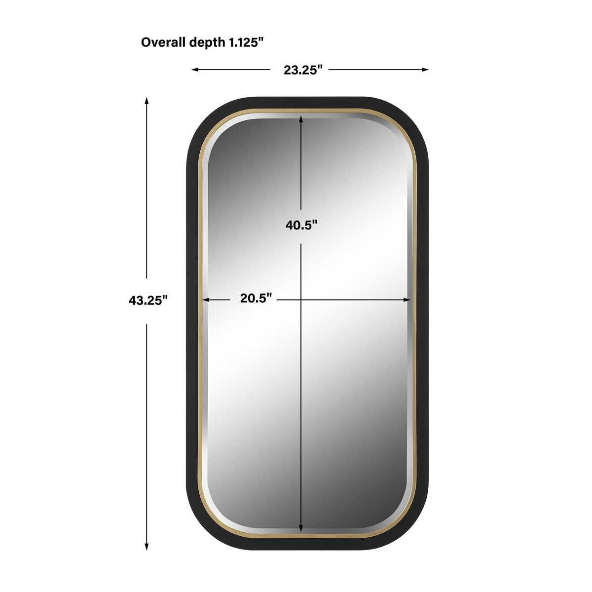 The Nevaeh mirror displays an elegant curved profile with a satin black finish, accented with a petite gold leaf inner edge. Mirror features a generous 1 1/4" bevel. May be hung horizontal or vertical. 23 W X 43 H X 1 D (in) - Additional Information